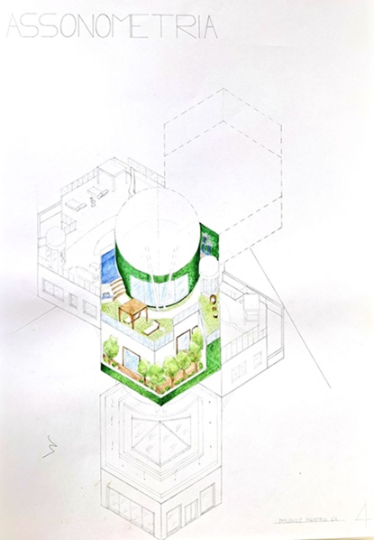 Questa è un'assonometria che raffigura un bosco verticale ispirato al conosciuto bosco verticale dell'architetto Boeri. La sua particolarità risiede nella forma poichè richiama la struttura di un alveare, cercando di massimizzare la presenza del verde all'interno di una città industrializzata.